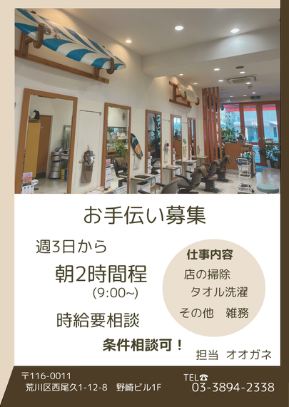 主な仕事内容は、お店の掃除全般・洗濯・事務 など